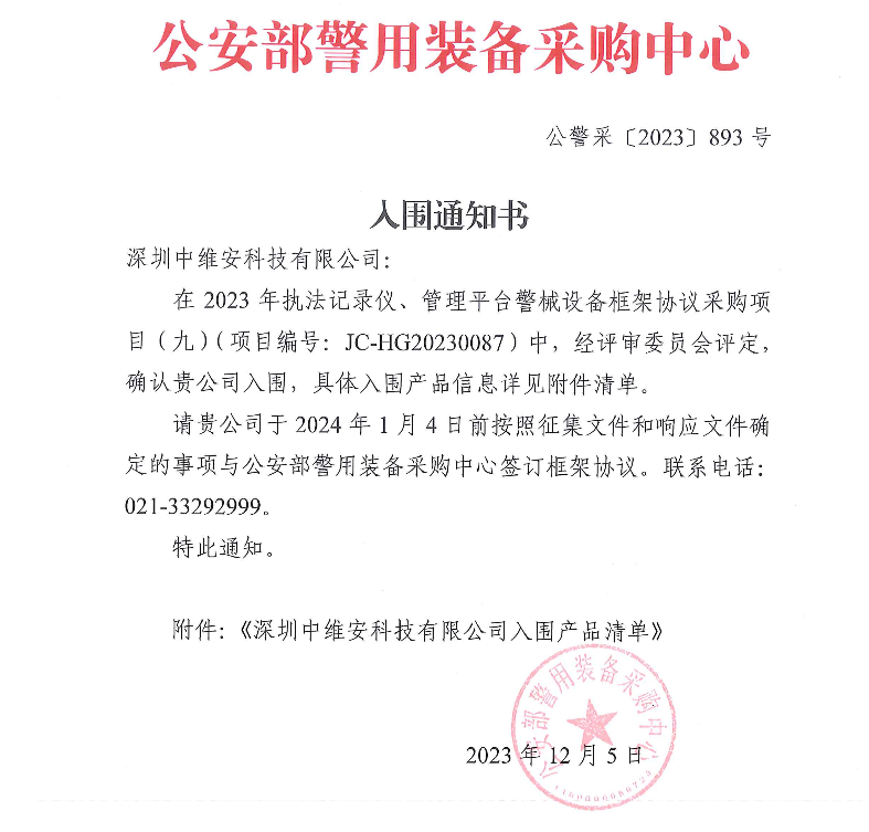 Recently, the "Announcement on Winning the Bid for the 2023 Law Enforcement Recorder and Management Platform Police Equipment Framework Agreement Procurement Project of the Ministry of Public Security Police Equipment Procurement Center" was released. The nationwide management platform (acquisition workstation) Z8 developed by Shenzhen Zhongwei Science and Technology was successfully shortlisted, marking that Zhongwei's police equipment products have been highly recognized by the public security department and further enhancing the market competitiveness of Zhongwei in law enforcement recorders and management platforms.